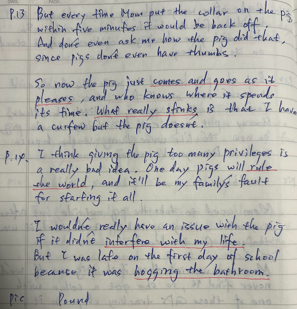 I describe the frustration of having a pet pig that refuses to keep its collar on, allowing it to roam freely. While the pig enjoys its newfound freedom, I am bound by a curfew. I believe giving the pig too many privileges is a bad idea, fearing it could lead to pigs ruling the world. I wouldn’t mind the pig if it didn’t disrupt my life, but I was late to school on the first day because the pig was occupying the bathroom. Despite initially looking forward to school starting, I soon realized it was just the same routine as before.