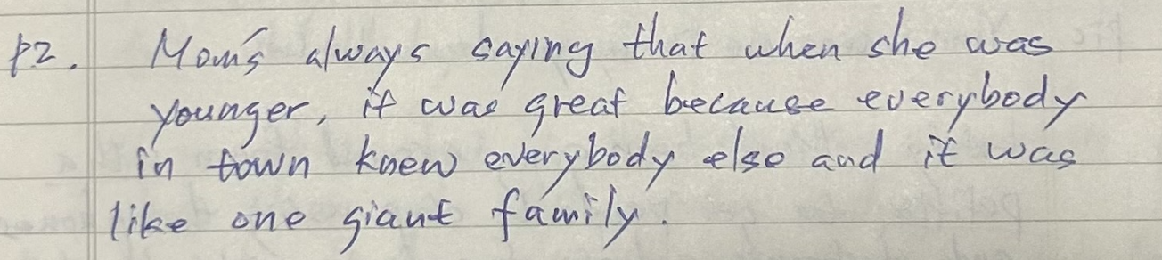 Mom's always saying that when when she was younger, it was great because everybody in town knew everybody else and it was like one giant family.