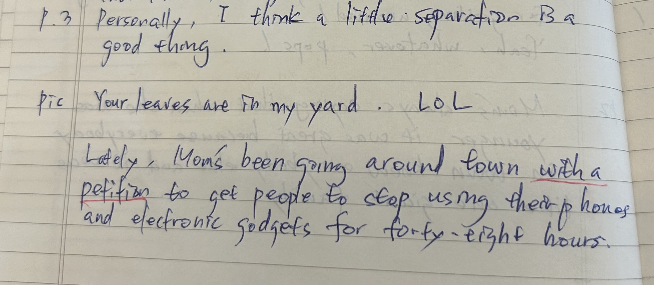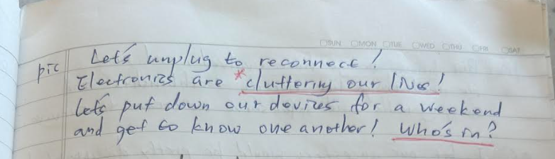 I believe that a little separation from technology is beneficial. Recently, Mom has been going around town with a petition urging people to stop using phones and electronic devices for 48 hours. She promotes the idea of unplugging to reconnect with one another and suggests putting down devices for a weekend to get to know each other better.