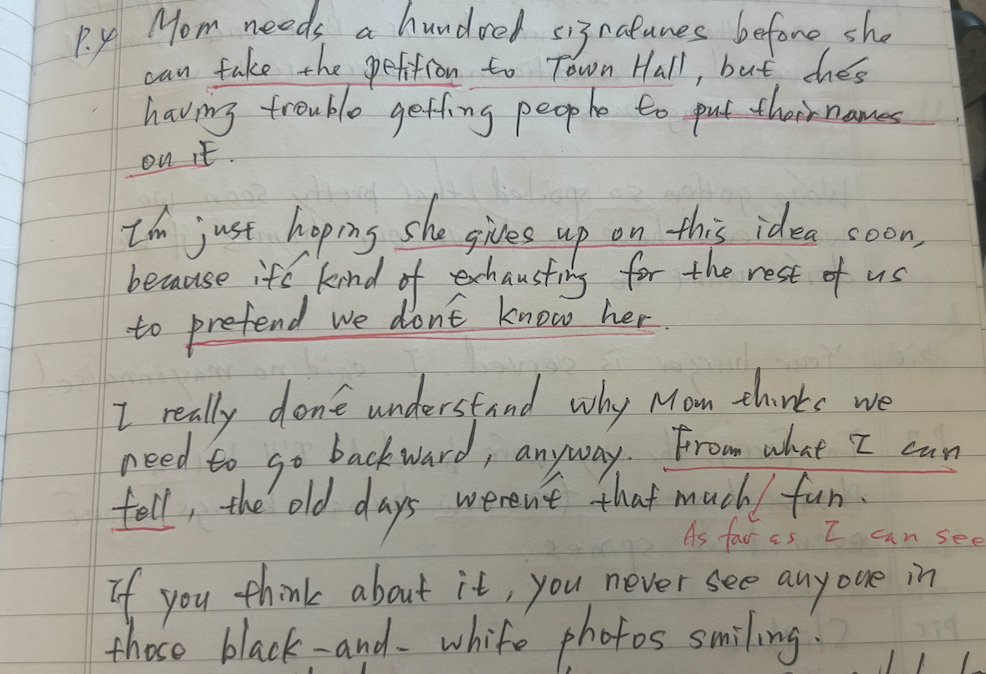 Mom is trying to gather a hundred signatures for a petition to take to Town Hall but is struggling to get people to sign it. I hope she will give up on this idea soon, as it’s exhausting to pretend not to know her. I question why Mom thinks returning to the past is necessary, believing that the old days weren’t particularly enjoyable, noting that people in black-and-white photos rarely smile.