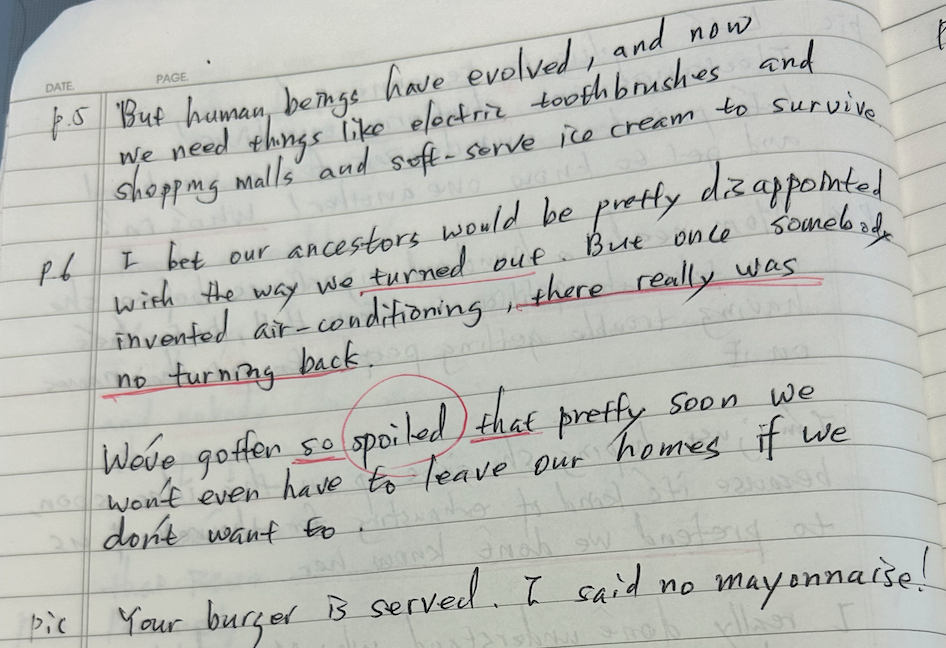과거에는 사람들이 오늘날보다 훨씬 더 강인했습니다. 그러나 우리는 진화하여 생존을 위해 전기 칫솔, 쇼핑몰, 소프트 아이스크림과 같은 편의에 의존하게 되었습니다. 나는 조상들이 우리가 이렇게 된 것에 실망할 것이라고 믿습니다. 에어컨이 발명된 이후로는 돌아갈 수 없게 되었습니다. 우리는 너무 버릇없이 자라서 곧 원하지 않으면 집에서조차 나갈 필요가 없게 될 것입니다.